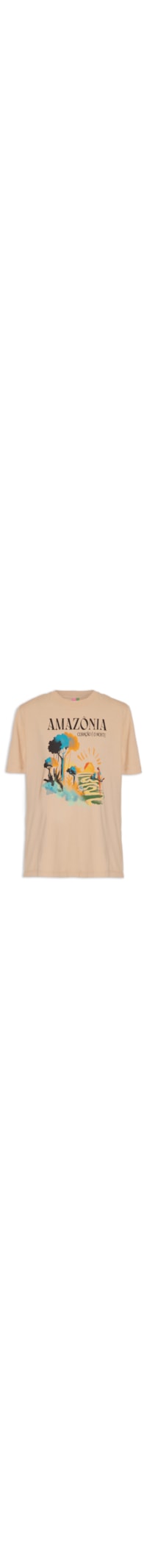 A camiseta bege é confeccionada em malha de algodão com média elasticidade. A peça solta ao corpo possui decote redondo com acabamento canelado, mangas curtas e estampa frontal figurativa e escrita aplicada em silk de tons contrastantes.
