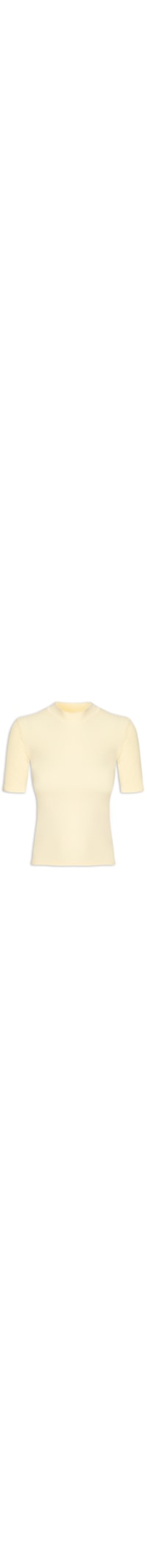A camiseta amarela é confeccionada em malha com superfície canelada e alta elasticidade. A peça justa ao corpo possui gola alta e mangas curtas.