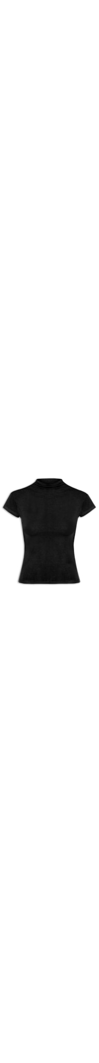 A camiseta preta é confeccionada em malha leve com alta elasticidade. A peça justa ao corpo possui gola alta e mangas curtas.