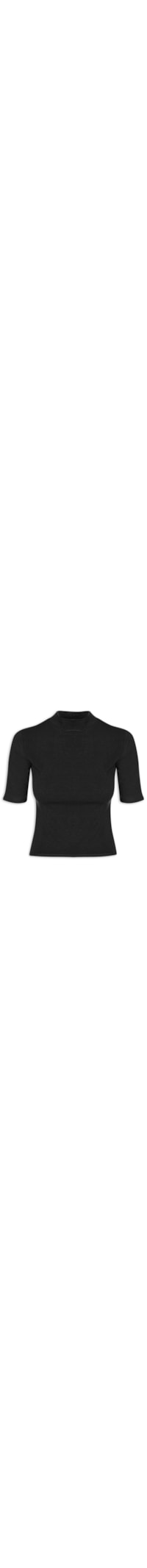 A camiseta preto é confeccionado em malha leve com efeito canelado . A peça justa ao corpo, possui gola média, manga curta. Sem fechamento e barra reta