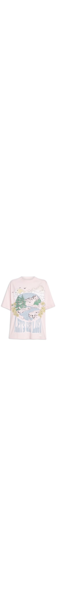 A camiseta rosa é confeccionada em malha de algodão com média elasticidade. A peça solta ao corpo possui decote redondo com acabamento canelado, ombros estendidos, mangas curtas e estampas figurativas aplicadas em silk na parte frontal,
