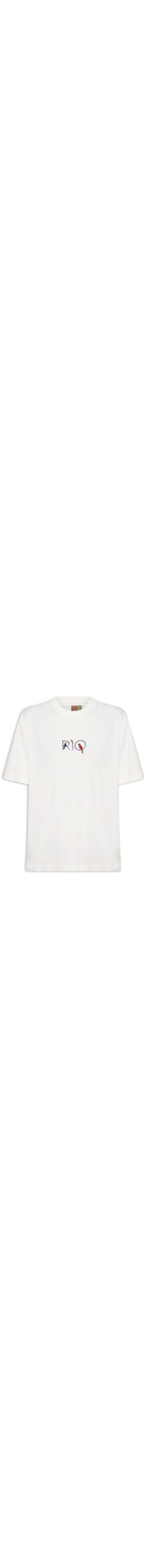 A camiseta branca é confeccionada em malha de algodão com baixa elasticidade. A peça solta ao corpo possui decote arredondado com acabamento canelado, mangas curtas e estampa figurativa aplicada em cores contrastantes na parte frontal.