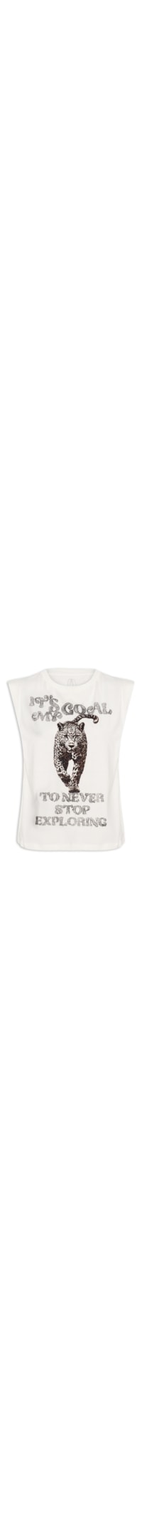 A camiseta branca é confeccionada em malha de algodão sem elasticidade. A peça solta ao corpo possui decote redondo com acabamento canelado, alças largas, estampa figurativa com superfície texturizada na parte frontal e tag da marca posterior.