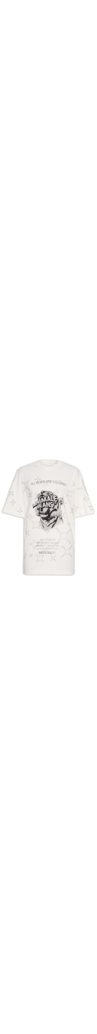 A camiseta off white é confeccionada em malha de algodão sem elasticidade. A peça solta ao corpo possui decote redondo com acabamento canelado, estampa figurativa frontal com aplicação de pedrarias, tag da marca posterior e mangas curtas.