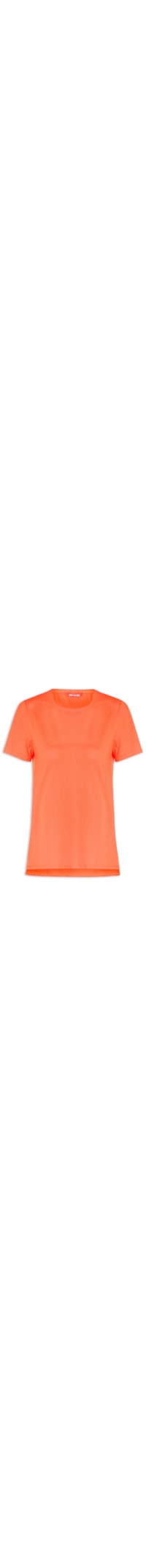 A camiseta laranja neon é confeccionada em mesh. A peça possui decote redondo com tag emborrachada da marca aplicada na parte posterior, mangas curtas, fendas laterais, barra mullet*, shape solto, caimento reto e acabamento pespontado.