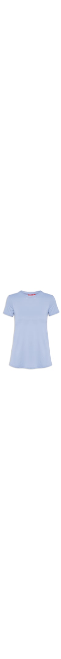 A camiseta azul é confeccionada em malha com alta elasticidade. A peça solta ao corpo possui decote redondo com acabamento canelado, mangas curtas, recorte posterior vazado, fenda posterior e tag da marca aplicada em borracha na parte posterior.