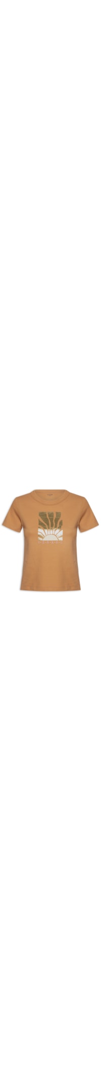 A camiseta marrom é confeccionada em malha de algodão, com baixa elasticidade. A peça solta ao corpo possui gola redonda com acabamento canelado, mangas curtas, estampa na parte frontal em silk em cores contrastantes.