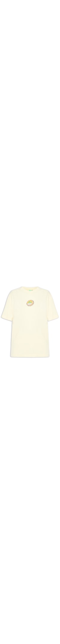 A camiseta amarela é confeccionada em malha de algodão com média elasticidade. A peça solta ao corpo possui decote arredondado, mangas curtas e estampa figurativa em cores contrastantes aplicada na parte frontal e posterior.