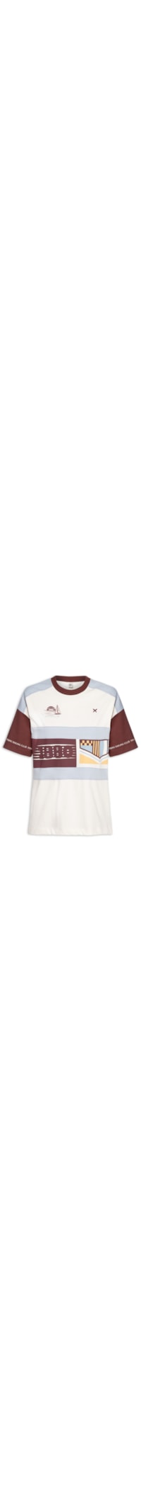 A camiseta branca é confeccionada em malha leve com média elasticidade. A peça solta ao corpo possui decote arredondado, mangas curtas, recortes em cores contrastantes, mix de estampas em cores contrastantes, logo da marca aplicado na parte frontal e pequenas fendas laterais.