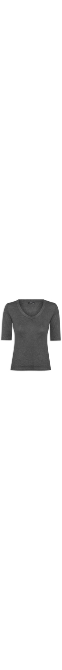 A camiseta cinza é confeccionado malha de alta elasticidade. A peça solta ao corpo possui decote V, mangas curtas, leve transparência e efeito mescla estonado.