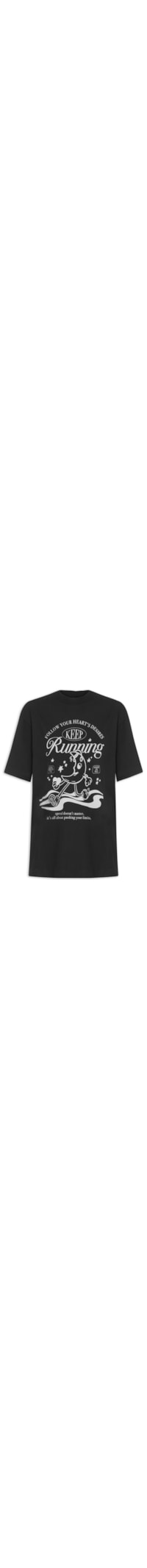 A camiseta preta é confeccionada em malha de algodão com baixa elasticidade. A peça solta ao corpo possui decote redondo com acabamento canelado, mangas curtas, ombros estendidos e estampa frontal em silk na cor bege.