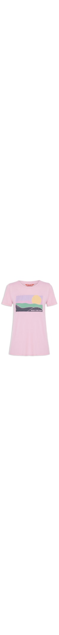 A camiseta rosa é confeccionada em malha com alta elasticidade. A peça solta ao corpo possui decote redondo com acabamento canelado, mangas curtas, leve transparência e estampa frontal figurativa de paisagem em cores contrastantes.