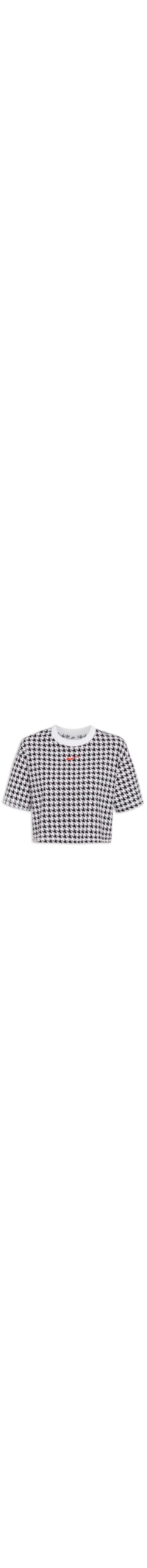 A camiseta branca é confeccionada em malha de algodão. A peça possui decote redondo com acabamento canelado, mangas curtas, estampa xadrez pied de poule, bordado frontal com logo da marca, caimento reto, comprimento cropped e acabamento pespontado.