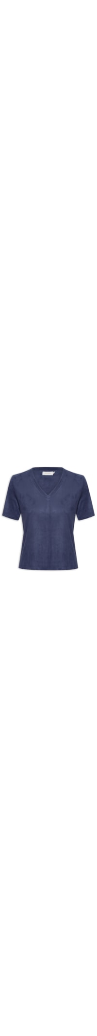 A camiseta azul marinho é confeccionada em tecido leve com superfície em veludo com baixa elasticidade. A peça solta ao corpo possui decote V com acabamento canelado, mangas curtas e recorte frontal pespontado.