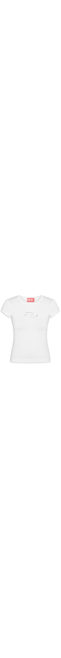 A camiseta branca é confeccionada em malha de algodão com baixa elasticidade. A peça justa ao corpo possui decote arredondado, mangas curtas e recortes vazados na parte frontal com aplicação do logo da marca.