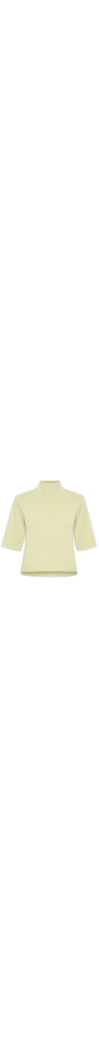 A camiseta verde é confeccionada em tricot de alta elasticidade. A peça solta ao corpo possui gola alta, mangas curtas, fendas laterais e comprimento cropped*.