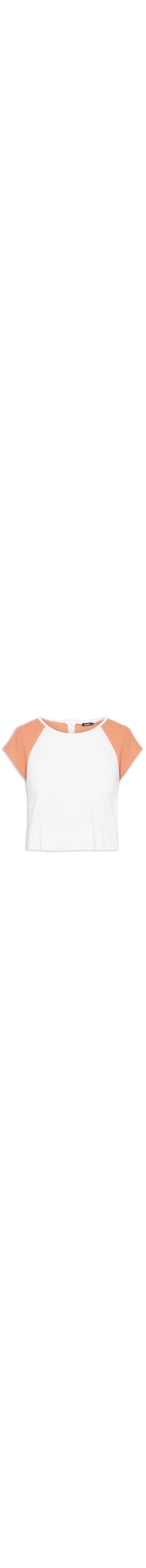 A camiseta bege é confeccionada em malha de algodão. A peça possui decote redondo, mangas curtas de modelo raglan, comprimento cropped, shape solto, caimento reto, acabamento pespontado e fechamento posterior por botão.