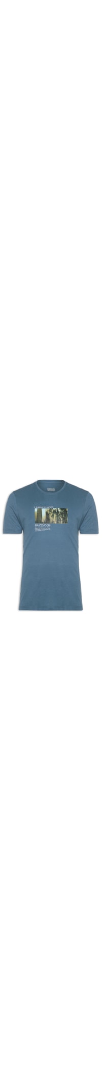 A camiseta azul é confeccionada em malha de algodão. A peça possui gola careca com acabamento canelado, mangas curtas, estampa em silk e cor contrastante na parte frontal, shape solto, caimento reto e acabamento pespontado.