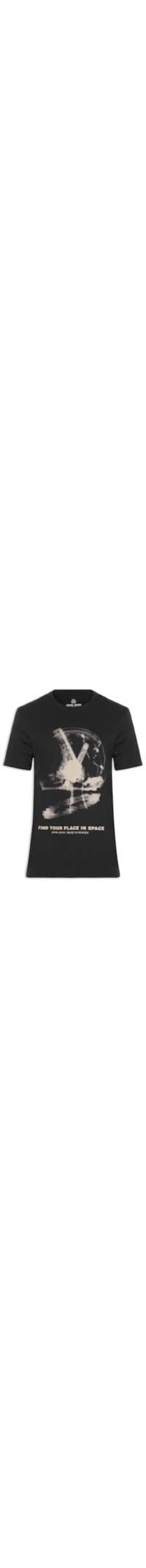 A camiseta preta é confeccionada em malha de algodão com baixa elasticidade. A peça solta ao corpo possui gola careca com acabamento canelado, mangas curtas e estampa figurativa em cor contrastante na parte frontal.