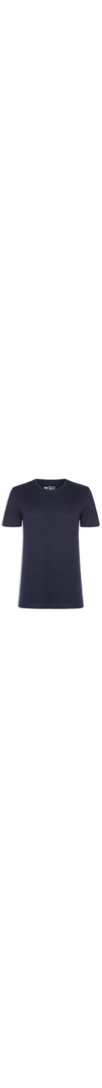 A camiseta azul é confeccionada em malha com média elasticidade. A peça solta ao corpo possui gola careca com acabamento canelado, mangas curtas e logo da marca bordado na altura do tórax.