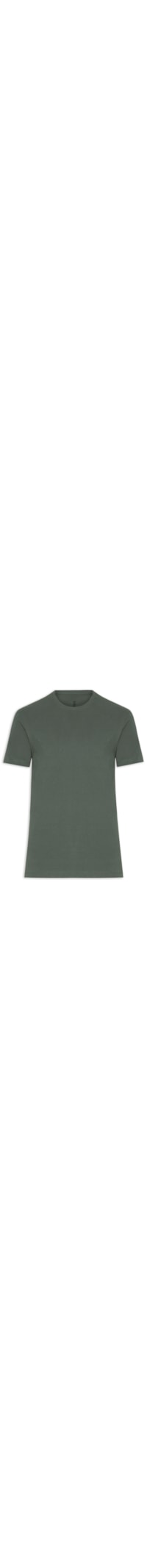 A camiseta verde é confeccionada em malha de algodão com baixa elasticidade. A peça solta ao corpo possui gola careca com acabamento canelado, mangas curtas e tag da marca bordada na manga esquerda.