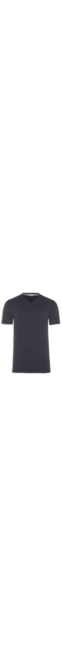 A camiseta azul marinho é confeccionada em malha de algodão. A peça possui gola V canelada, mangas curtas, caimento reto e acabamento pespontado.