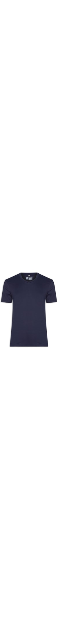 A camiseta azul é confeccionada em malha de algodão com média elasticidade. A peça solta ao corpo possui gola V com acabamento canelado, mangas curtas e logo da marca bordado na parte posterior.