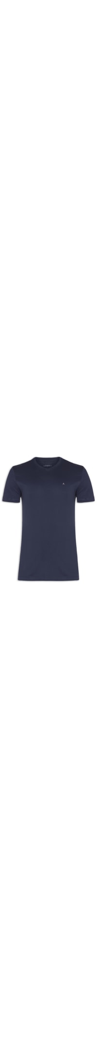 A camiseta azul marinho é confeccionada em malha de algodão. A peça possui gola V com acabamento canelado, mangas curtas, logo da marca bordado na altura do tórax em cores contrastantes, shape solto, caimento reto e acabamento pespontado.