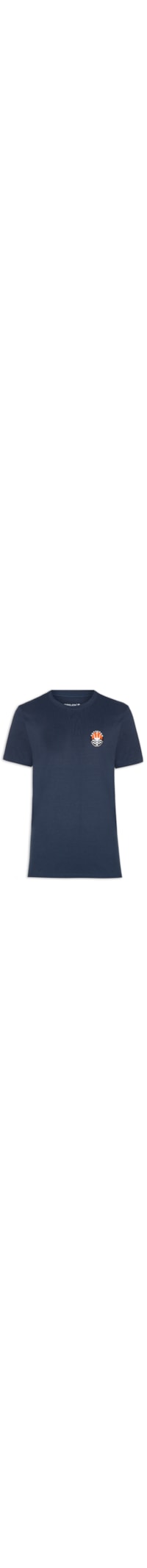 A t-shirt azul marinho é confeccionada em malha leve de média elasticidade. A peça solta ao corpo, possui gola careca com acabamento canelado, mangas curtas e estampa figurativa de selo da marca na altura do tórax em cores contrastantes.
