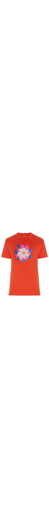 A t-shirt vermelha é confeccionada em malha de algodão com baixa elasticidade. A peça solta ao corpo possui gola careca, mangas curtas e estampa figurativa de flor em silk de tons contrastantes.
