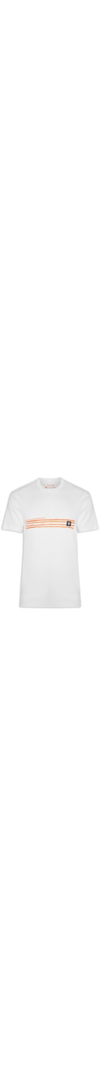 A t-shrit branca é confeccionada em malha de algodão com média elasticidade. A peça solta ao corpo possui gola redonda com acabamento canelado, ombros estendidos, mangas curtas, estampa frontal aplicada em silk de cores contrastantes.