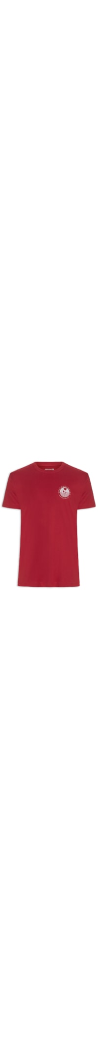 A Camiseta vermelha é confeccionada em malha de algodão com média elasticidade. A peça solta ao corpo possui gola careca com acabamento canelado, mangas curtas, ombros estendidos e estampa localizada na altura do tórax frontal.