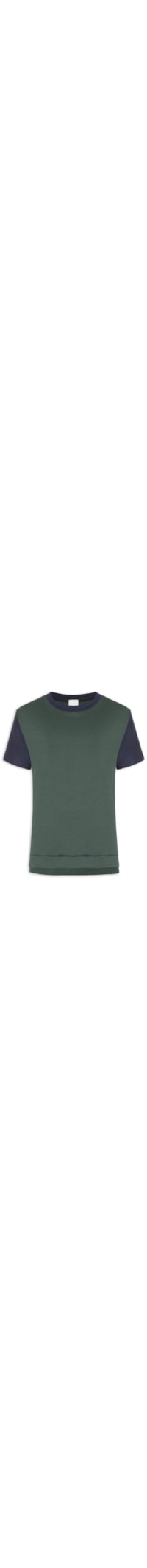 A Camiseta verde é confeccionada em malha canelada. A peça possui gola carega, mangas curtas com cor contrastante, shape solto, caimento reto e acabamento pespontado.
