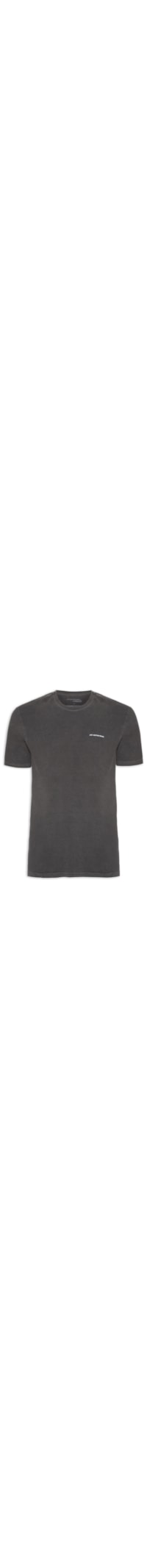 A camiseta cinza é confeccionada em malha de algodão. A peça possui gola careca com acabamento canelado, mangas curtas, nome da marca aplicado em silk na parte frontal do tórax, estampa figurativa e escrita aplicadas em silk na parte posterior, tag da marca bordada na parte frontal da barra, efeito estonado e shape solto.