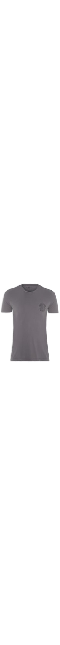 a t-shirt Cinza é Confeccionada Em malha De Algodão. A Peça Possui Gola Careca Com Acabamento Canelado, Mangas Curtas, Estampa Frontal E Posterior Aplicada Em Silk E Cor Contrastante, Shape Solto, Caimento Reto E Acabamento Pespontado.