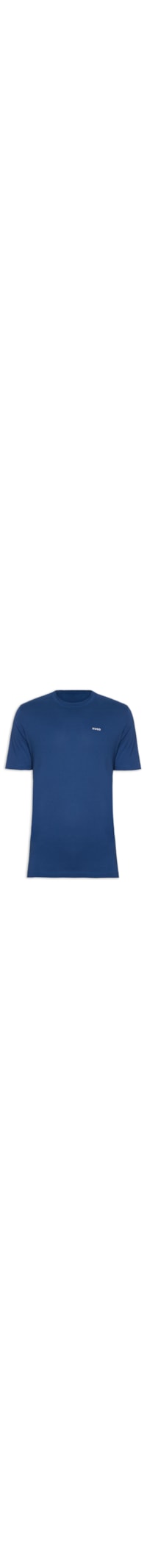 A t-shirt azul é confeccionada em malha de algodão com baixa elasticidade. A peça solta ao corpo possui gola careca com acabamento canelado, mangas curtas, ombros e cavas regulares e nome da marca aplicado na altura do tórax em cor contrastante.