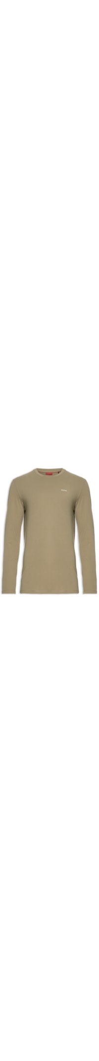 A Camiseta marrom é confeccionada em malha. A peça solta ao corpo, possui gola careca com acabamento canelado, ombros regulares, cavas levemente estendidas, mangas longas, nome da marca aplicado na altura do tórax em borracha com cor contrastante.
