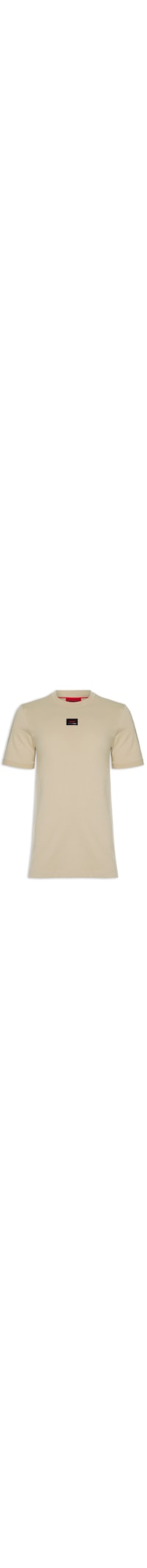 A Camiseta bege é confeccionada em malha de algodão com baixa elasticidade. A peça solta ao corpo possui gola careca com acabamento canelado, mangas curtas com detalhe canelado e tag da marca emborrachada aplicada na parte frontal em cor contrastante.