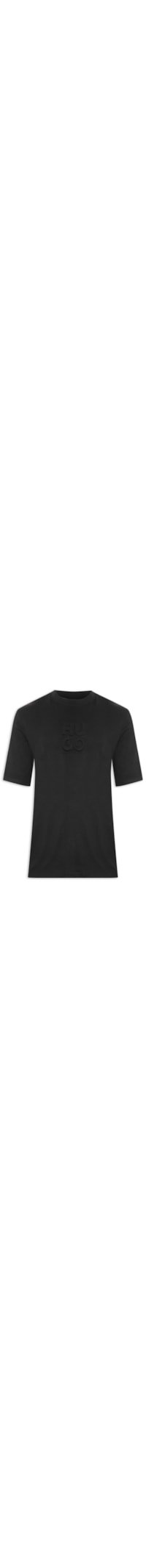 A Camiseta preta é confeccionada em malha de algodão com média elasticidade. A peça solta no corpo possui gola careca com acabamento canelado, mangas curtas e nome da marca aplicado em relevo na parte frontal.