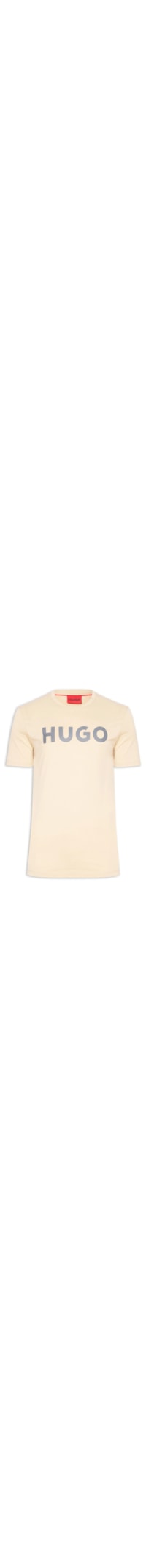 A camiseta bege é confeccionada em malha de algodão com média elasticidade. A peça solta ao corpo possui gola careca com acabamento canelado, mangas curtas e nome da marca aplicado em borracha branca na altura do tórax.