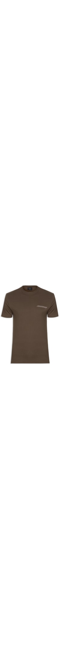 A camiseta marrom é confeccionada em malha de algodão sem elasticidade. A peça solta ao corpo possui gola careca com acabamento canelado, mangas curtas e estampa com logo da marca aplicado na altura do tórax em cor contrastante.