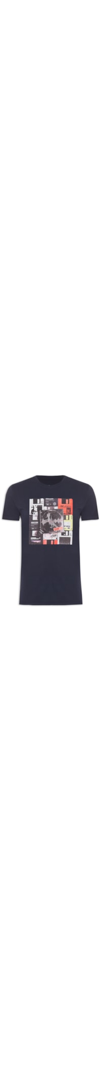 A camiseta azul é confeccionada em malha de algodão. A peça possui gola redonda canelada, mangas curtas, shape solto, caimento reto, estampa em silk frontal e acabamento pespontado.