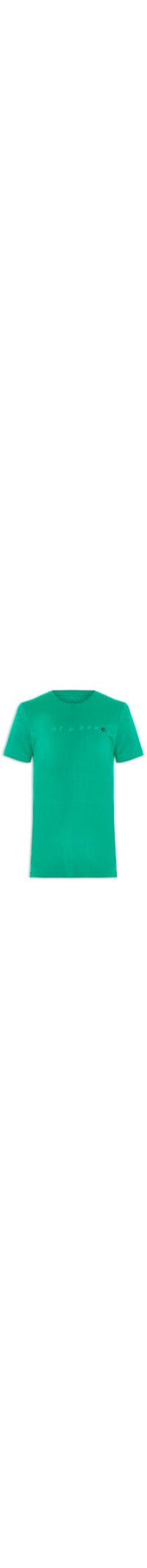 A camiseta verde é confeccionada em malha de algodão. A peça possui gola careca com acabamento canelado, mangas curtas, estampa frontal de escrita em cor contrastante e shape solto.