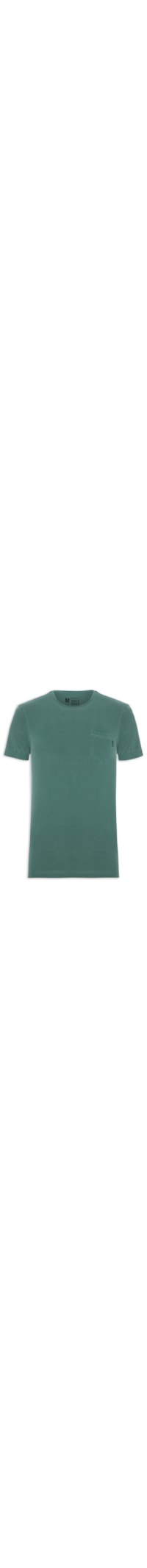 A camiseta verde é confeccionada em malha de algodão com elasticidade média. A peça solta ao corpo possui gola careca com acabamento canelado, mangas curtas, bolso aplicado na altura do tórax frontal e tag da marca aplicada no bolso.