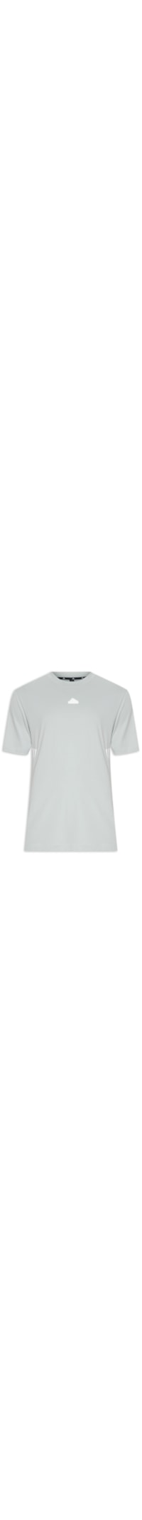 A camiseta cinza é confeccionada em malha de algodão com baixa elasticidade. A peça solta ao corpo possui gola careca com acabamento canelado, mangas curtas, tag emborrachada da marca aplicada na parte frontal do tórax e laterais com aplicação de listras emborrachadas de cor contrastante.
