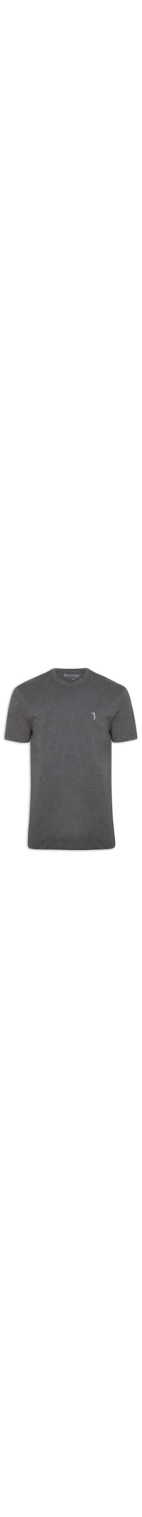 A camiseta cinza é confeccionada em malha de algodão com média elasticidade. A peça solta ao corpo possui gola careca com acabamento canelado, mangas curtas, aplicação frontal de bordado em tom contrastante, efeito mescla e leve transparência.