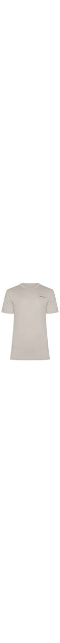A camiseta bege é confeccionada em malha de algodão com média elasticidade. A peça solta ao corpo possui gola careca com acabamento canelado, mangas curtas e aplicação em borracha do nome da marca e de escrita em cor contrastante.