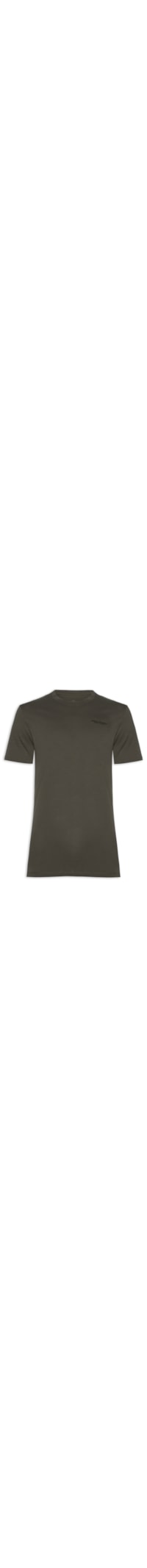 A Camiseta verde é confeccionada em malha de algodão com média elasticidade. A peça solta ao corpo possui gola careca com acabamento canelado, mangas curtas e aplicação em borracha do nome da marca e escrita em cor contrastante.