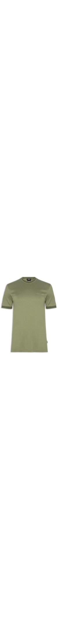 A camiseta verde é confeccionada em malha leve com alta elasticidade. A peça solta ao corpo possui gola arredondada em cor contrastante, mangas curtas com detalhe em cor contrastante, pequenas fendas laterais e logo da marca emborrachado aplicado.