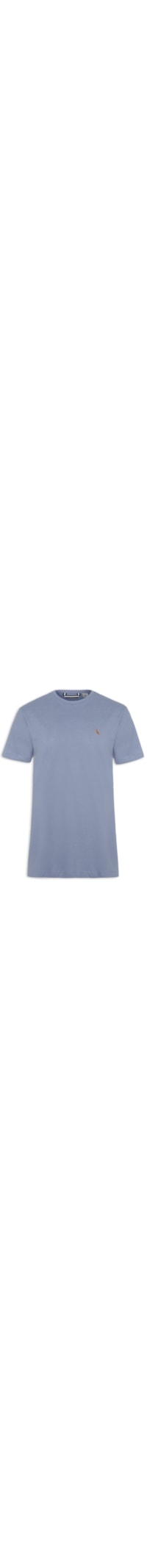 A camiseta azul é confeccionada em malha. A peça possui gola careca, mangas curtas, recorte posterior, detalhe de pesponto nas partes laterais e no recorte posterior em cor contrastante, logo da marca bordado na altura do tórax em cor contrastante, shape solto, caimento reto e acabamento pespontado.